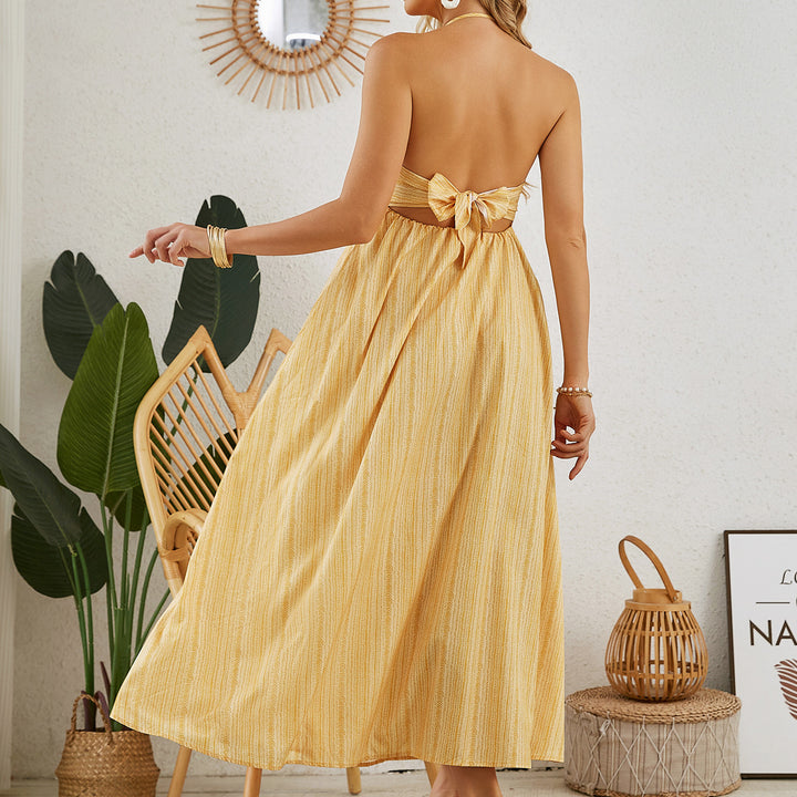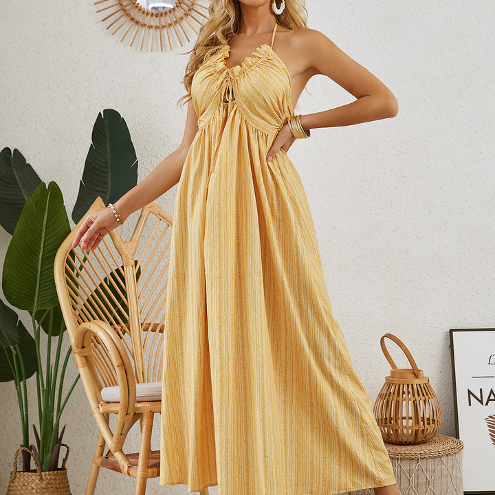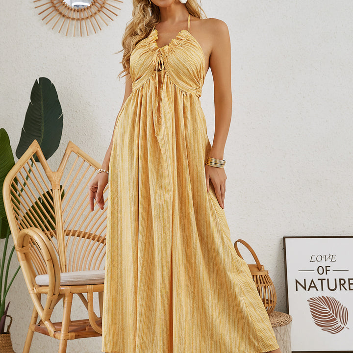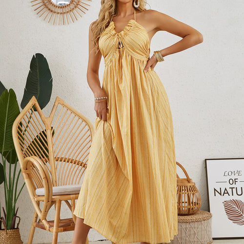Embrace the carefree spirit of summer with this Bohemian Halter Maxi Dress. Designed with a flattering halter neckline and a beautiful flowy silhouette, this dress is perfect for warm-weather days. The light and airy fabric drapes elegantly, while the subtle stripe pattern adds a touch of timeless style.